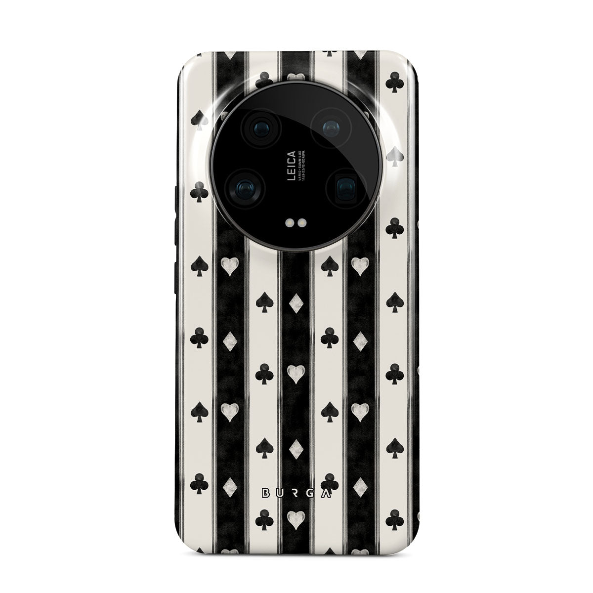 Este design contém: riscas preto e branco, corações, naipes de cartas, estilo vintage