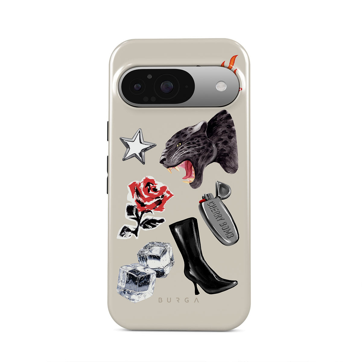 Este design contém: pantera negra, rosa vermelha, pimento a arder, isqueiro prateado, botas pretas até ao joelho, cubos de gelo, estrela prateada.
