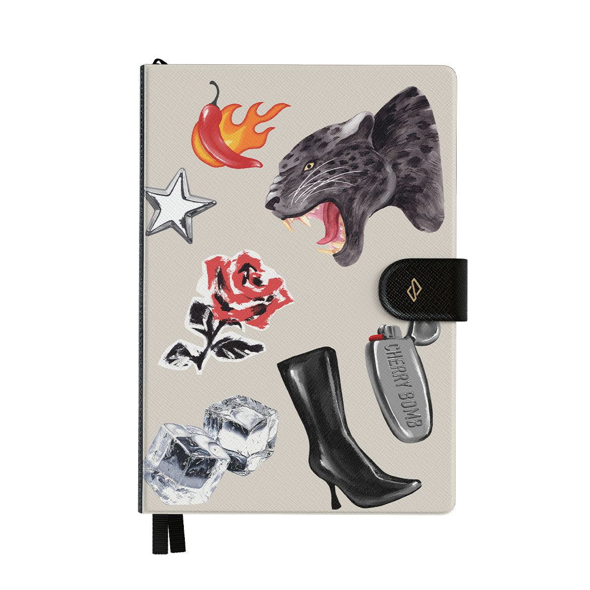Este design contém: pantera negra, rosa vermelha, pimento a arder, isqueiro prateado, botas pretas até ao joelho, cubos de gelo, estrela prateada.
