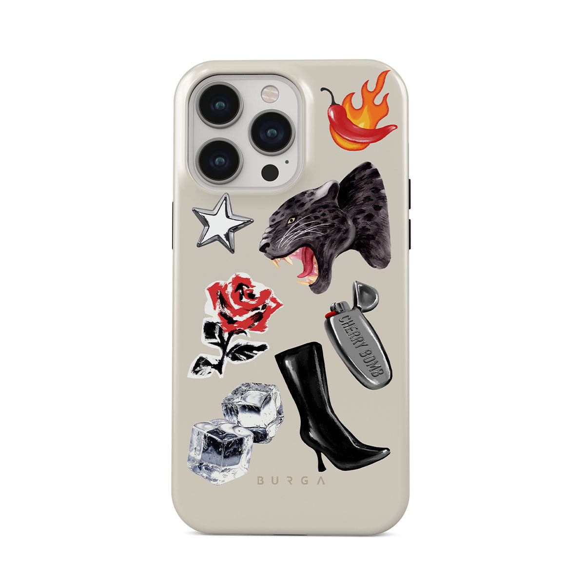 Este design contém: pantera negra, rosa vermelha, pimento a arder, isqueiro prateado, botas pretas até ao joelho, cubos de gelo, estrela prateada.