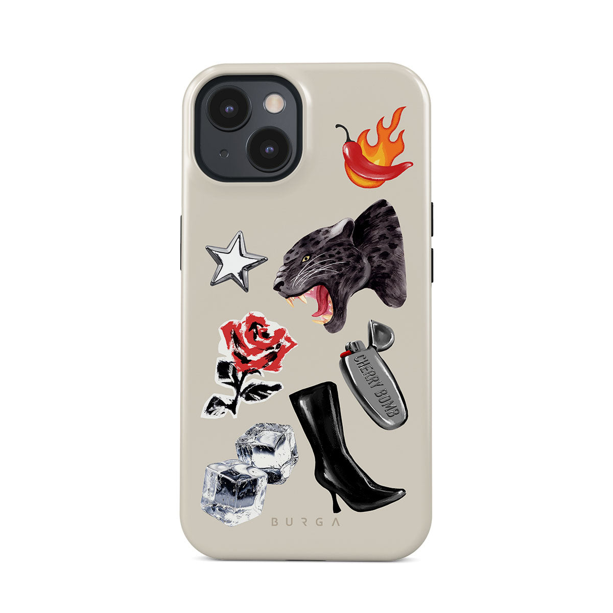 Este design contém: pantera negra, rosa vermelha, pimento a arder, isqueiro prateado, botas pretas até ao joelho, cubos de gelo, estrela prateada.