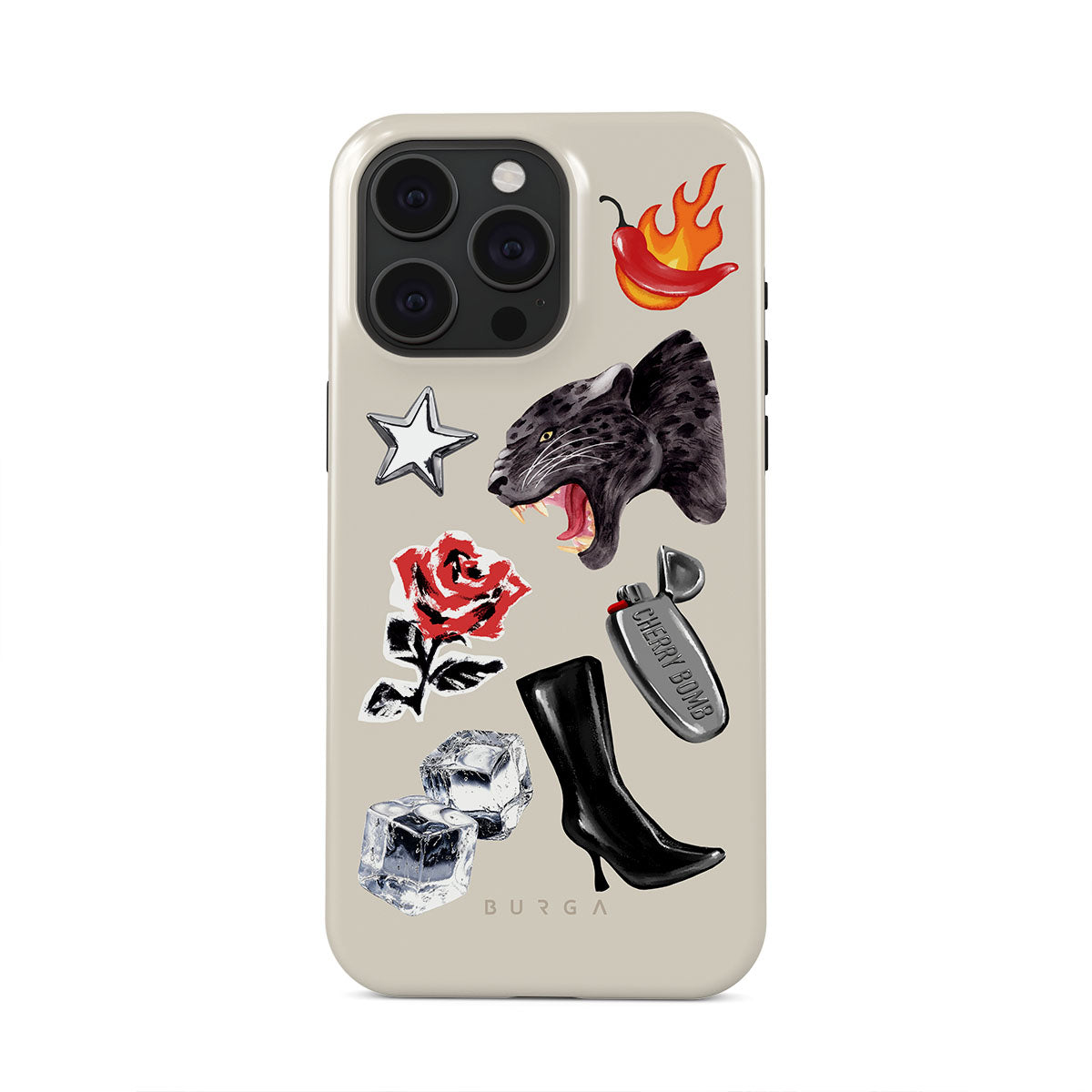 Este design contém: pantera negra, rosa vermelha, pimento a arder, isqueiro prateado, botas pretas até ao joelho, cubos de gelo, estrela prateada.