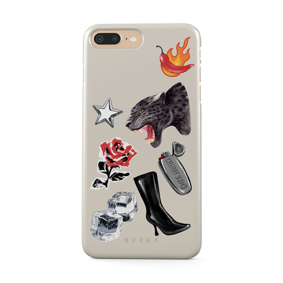 Este design contém: pantera negra, rosa vermelha, pimento a arder, isqueiro prateado, botas pretas até ao joelho, cubos de gelo, estrela prateada.