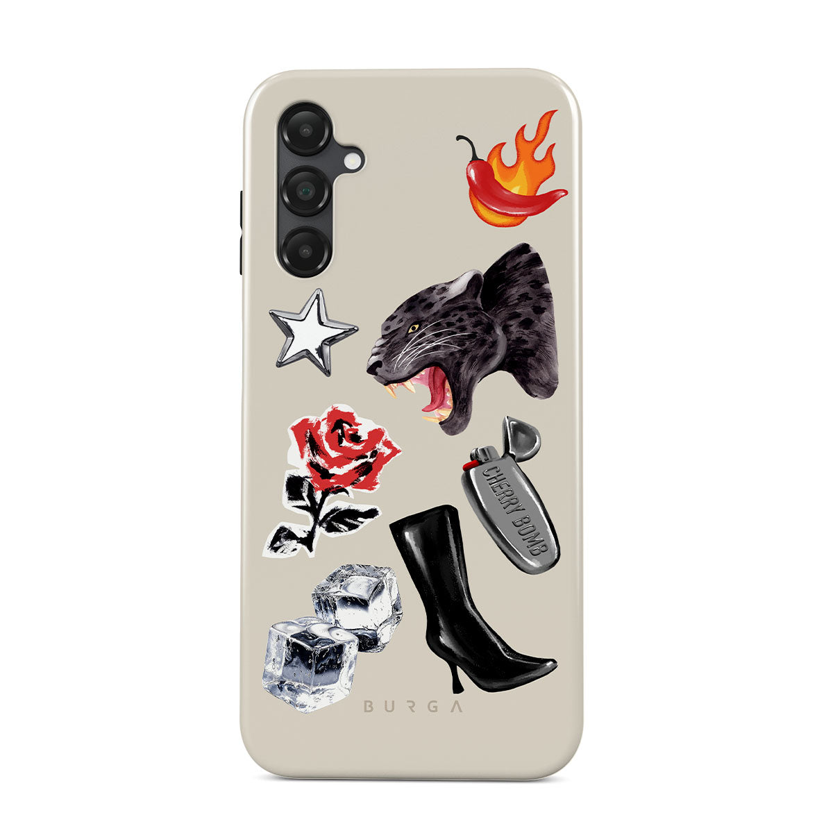 Este design contém: pantera negra, rosa vermelha, pimento a arder, isqueiro prateado, botas pretas até ao joelho, cubos de gelo, estrela prateada.