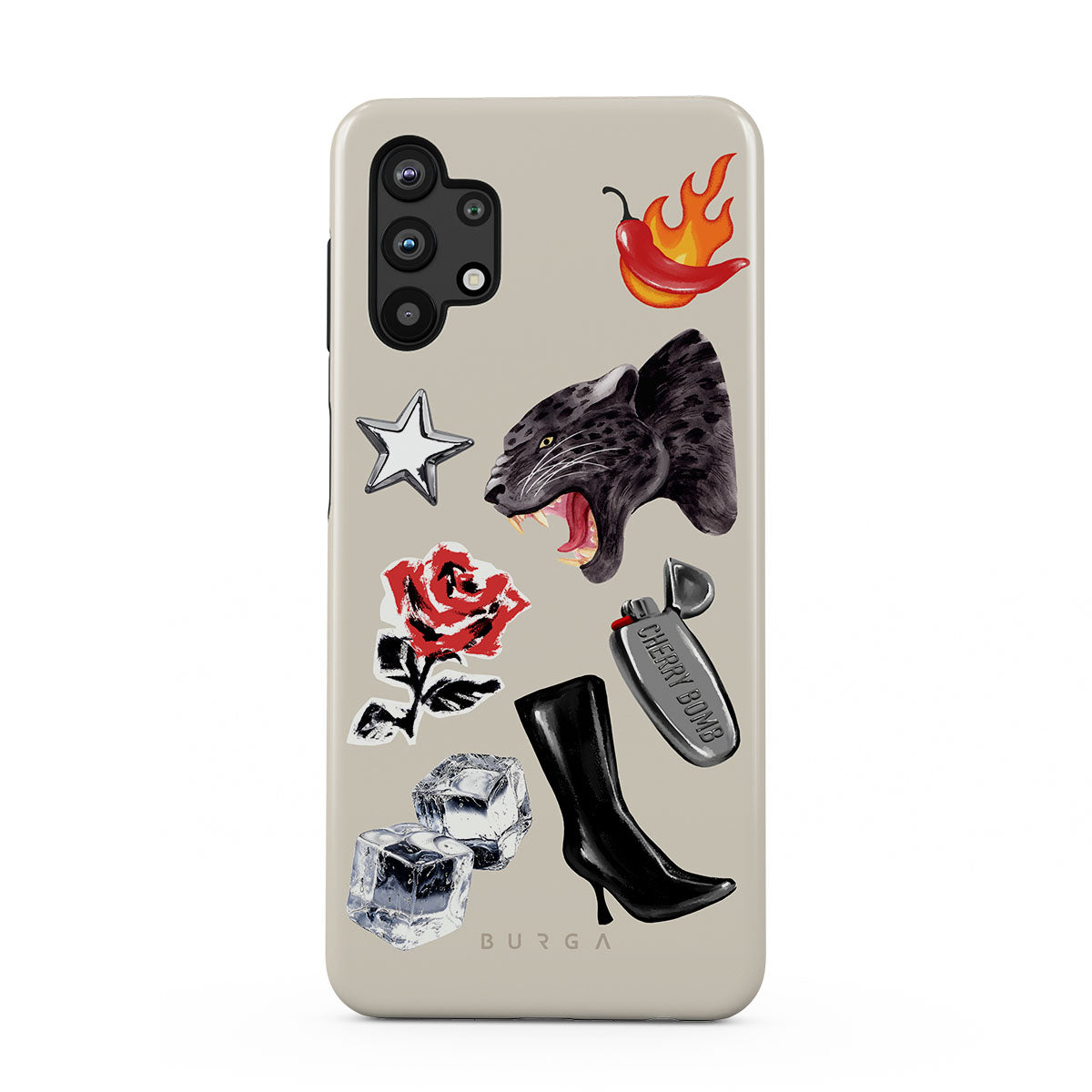 Este design contém: pantera negra, rosa vermelha, pimento a arder, isqueiro prateado, botas pretas até ao joelho, cubos de gelo, estrela prateada.