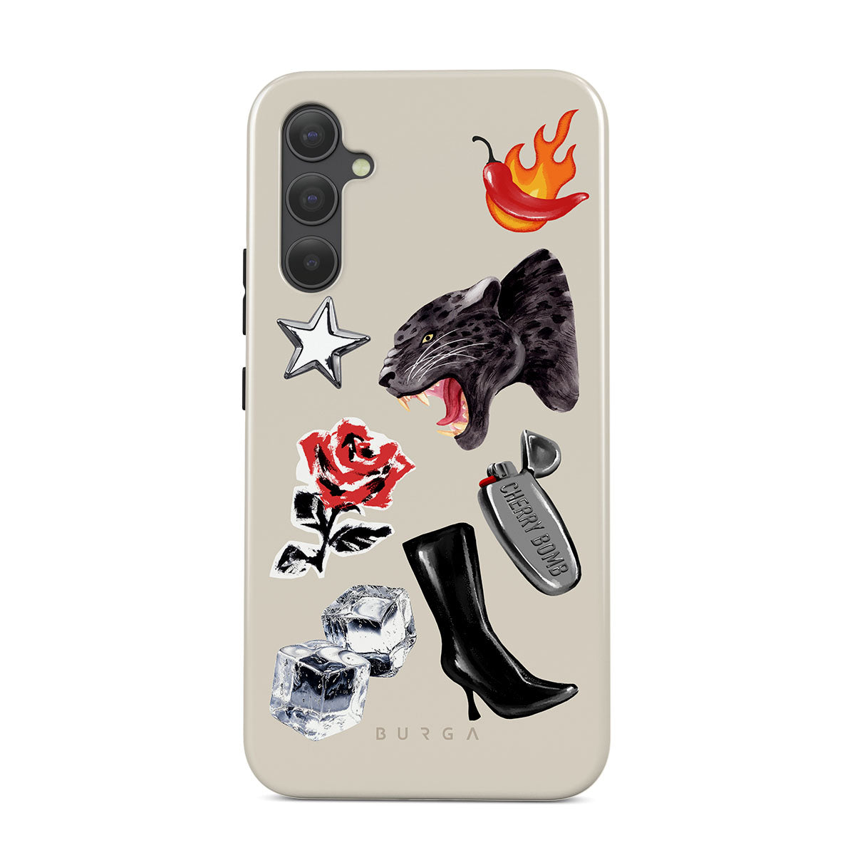 Este design contém: pantera negra, rosa vermelha, pimento a arder, isqueiro prateado, botas pretas até ao joelho, cubos de gelo, estrela prateada.
