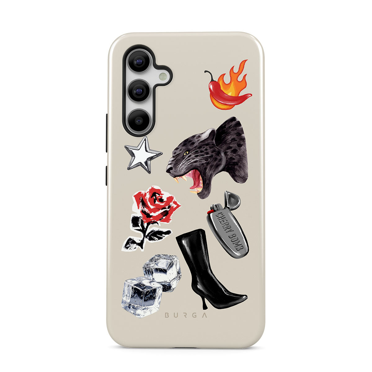 Este design contém: pantera negra, rosa vermelha, pimento a arder, isqueiro prateado, botas pretas até ao joelho, cubos de gelo, estrela prateada.