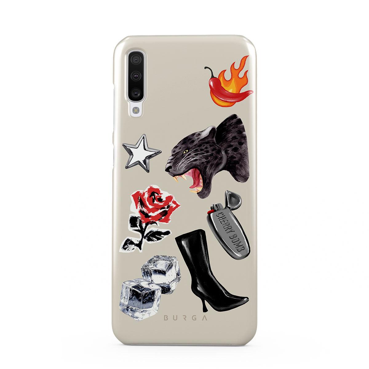 Este design contém: pantera negra, rosa vermelha, pimento a arder, isqueiro prateado, botas pretas até ao joelho, cubos de gelo, estrela prateada.