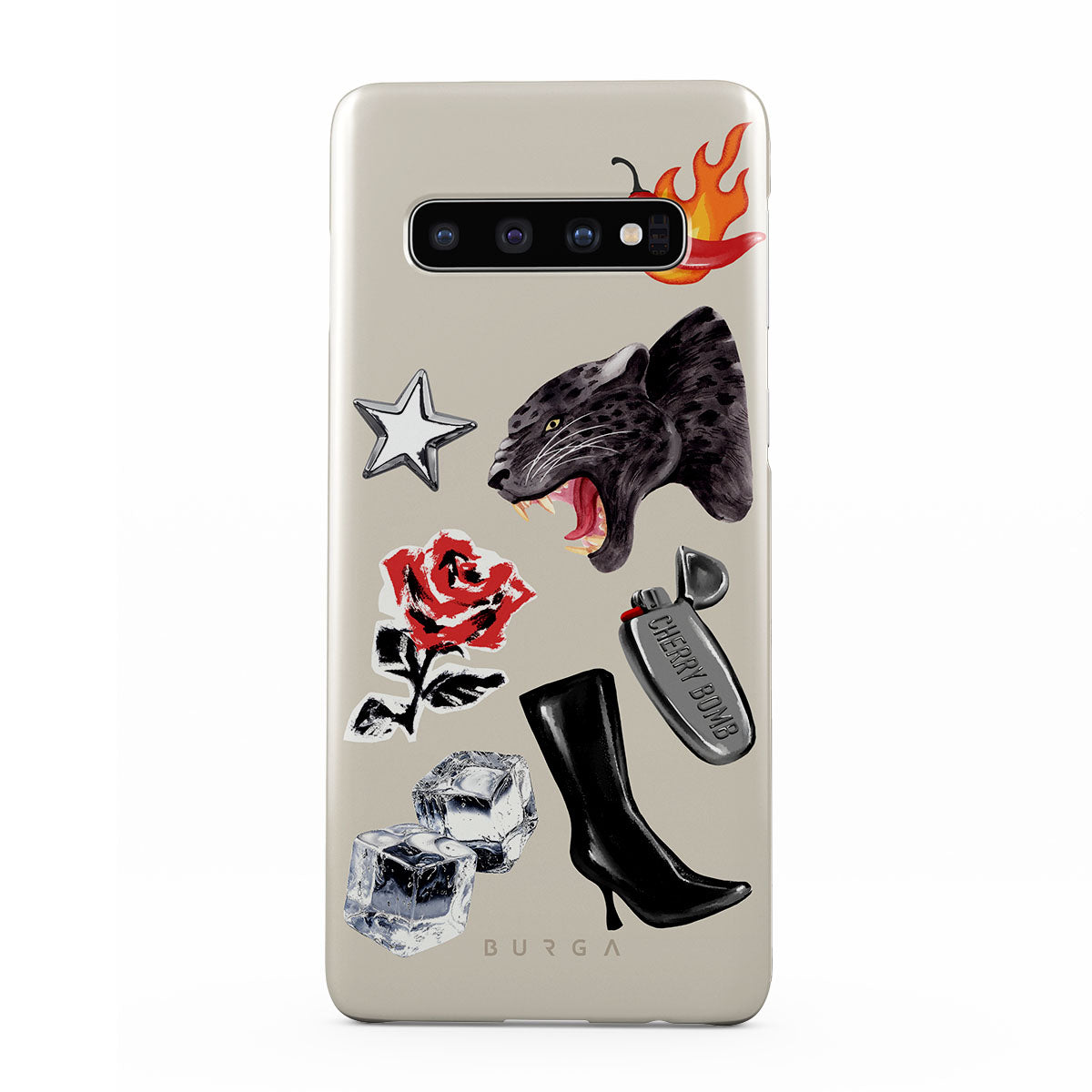 Este design contém: pantera negra, rosa vermelha, pimento a arder, isqueiro prateado, botas pretas até ao joelho, cubos de gelo, estrela prateada.