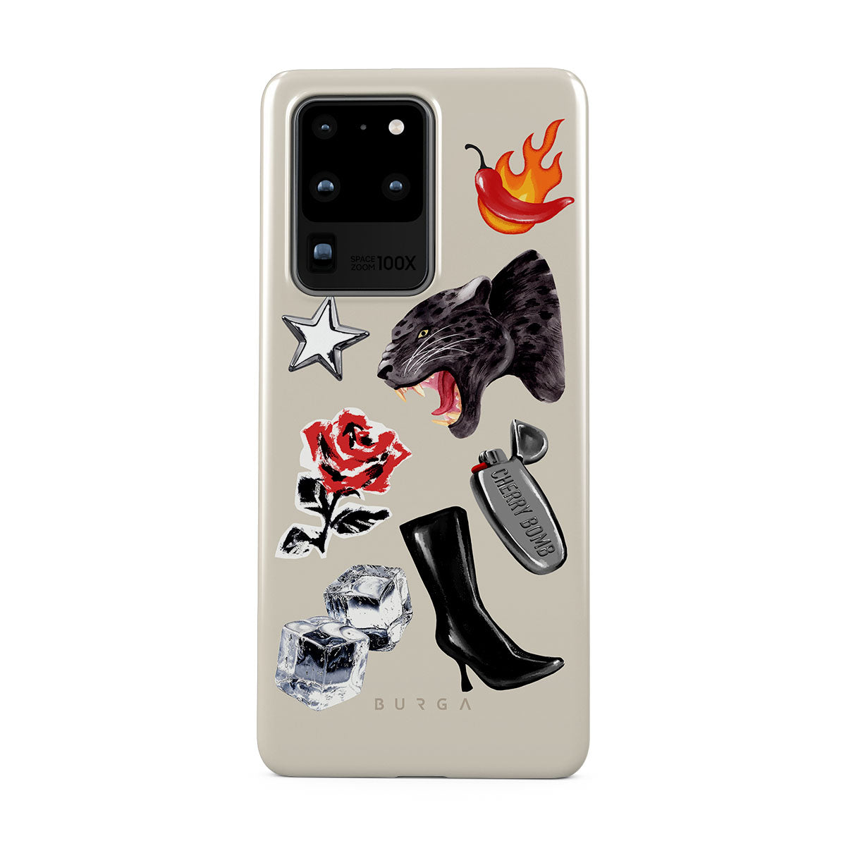 Este design contém: pantera negra, rosa vermelha, pimento a arder, isqueiro prateado, botas pretas até ao joelho, cubos de gelo, estrela prateada.