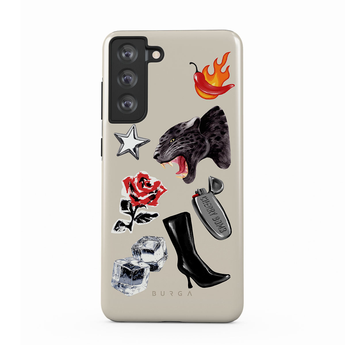 Este design contém: pantera negra, rosa vermelha, pimento a arder, isqueiro prateado, botas pretas até ao joelho, cubos de gelo, estrela prateada.