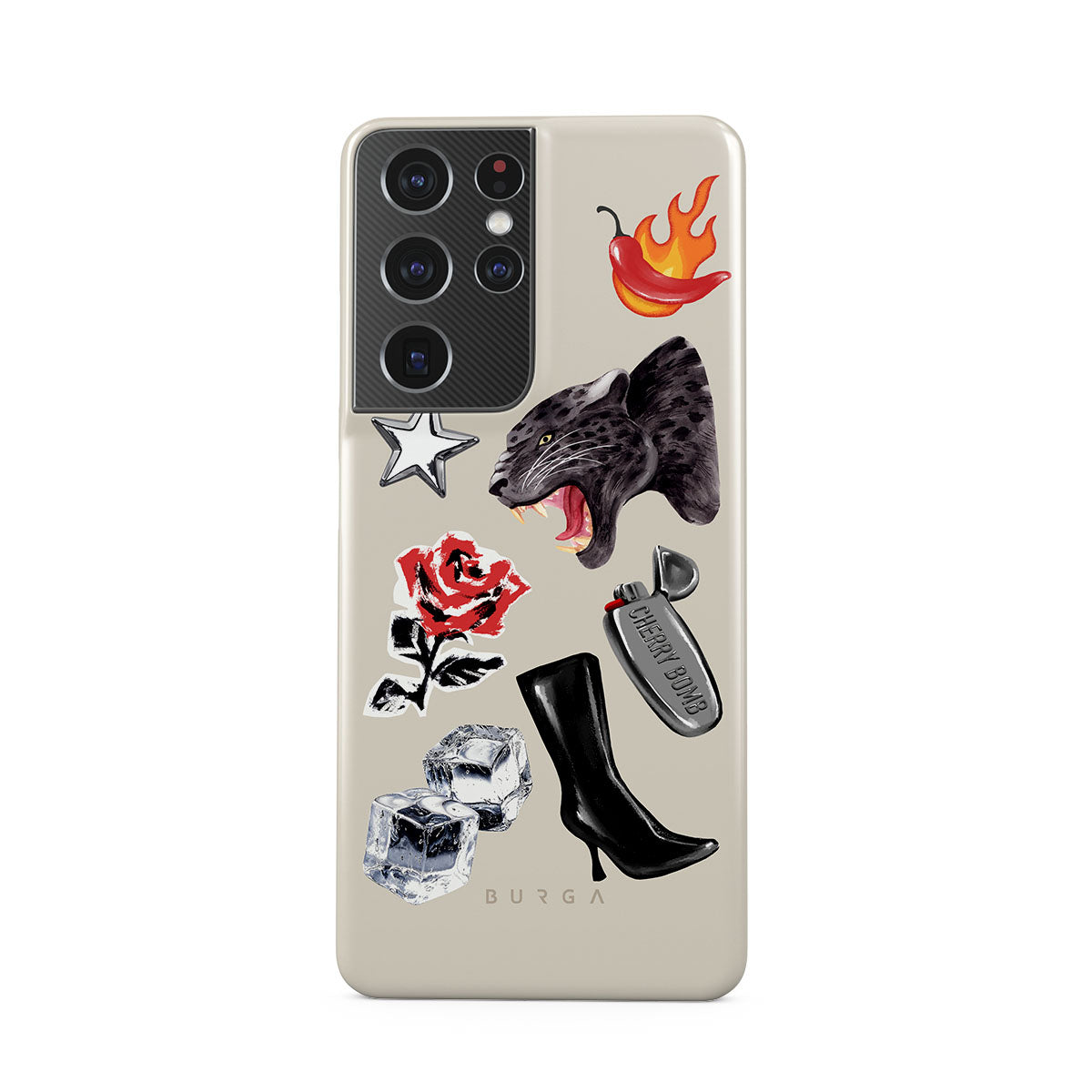 Este design contém: pantera negra, rosa vermelha, pimento a arder, isqueiro prateado, botas pretas até ao joelho, cubos de gelo, estrela prateada.