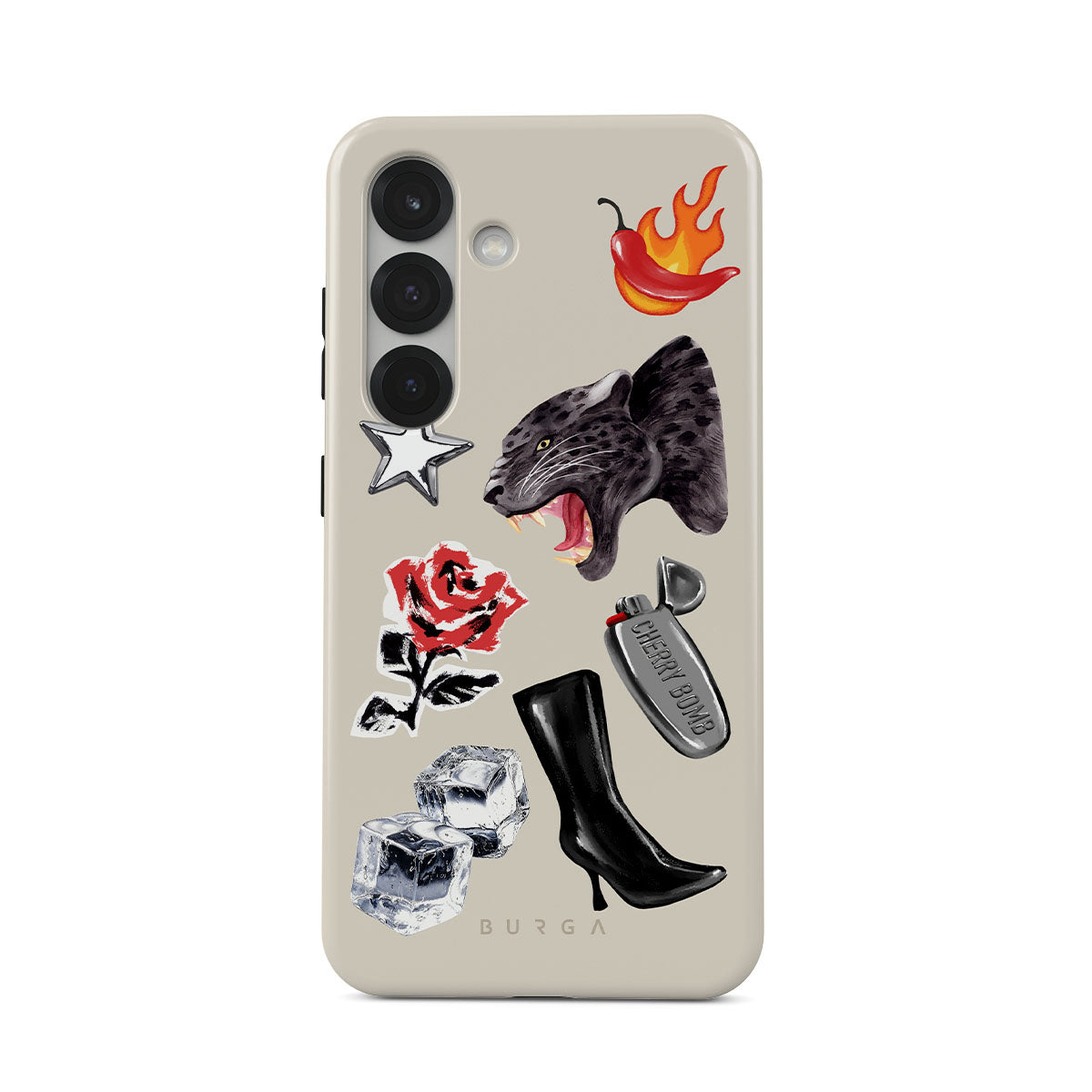 Este design contém: pantera negra, rosa vermelha, pimento a arder, isqueiro prateado, botas pretas até ao joelho, cubos de gelo, estrela prateada.