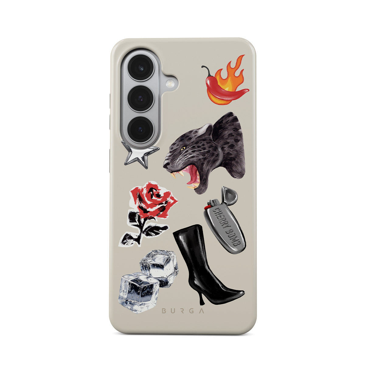 Este design contém: pantera negra, rosa vermelha, pimento a arder, isqueiro prateado, botas pretas até ao joelho, cubos de gelo, estrela prateada.