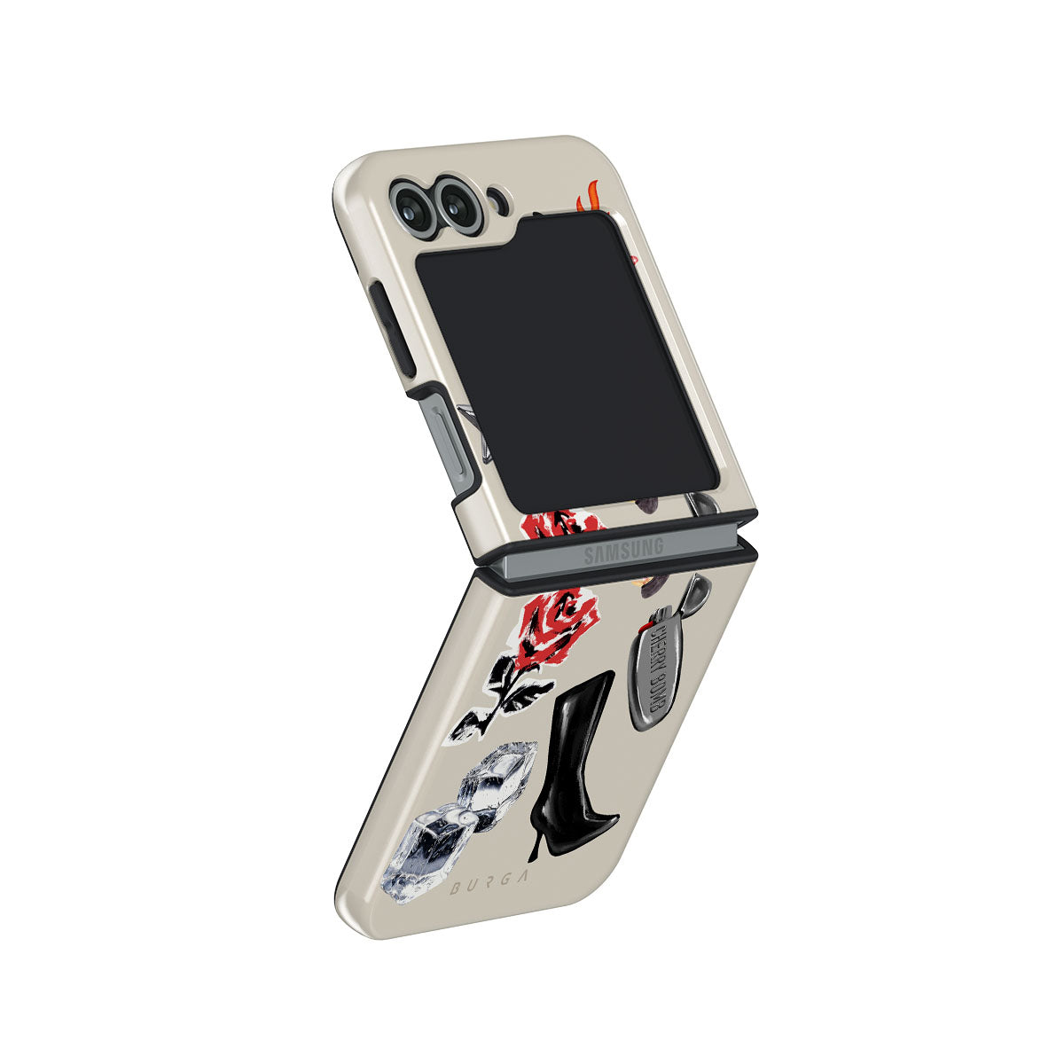 Este design contém: pantera negra, rosa vermelha, pimento a arder, isqueiro prateado, botas pretas até ao joelho, cubos de gelo, estrela prateada.