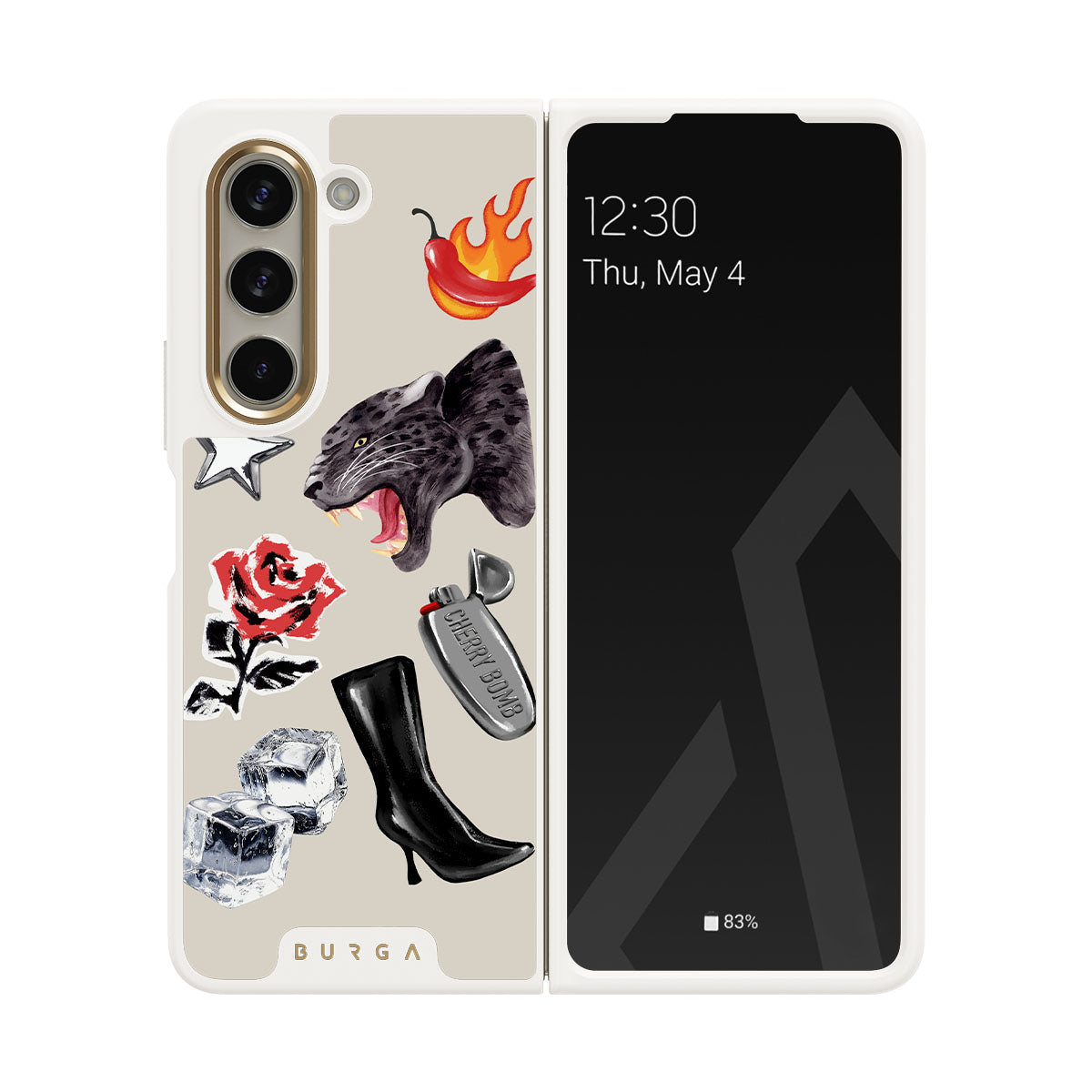 Este design contém: pantera negra, rosa vermelha, pimento a arder, isqueiro prateado, botas pretas até ao joelho, cubos de gelo, estrela prateada.