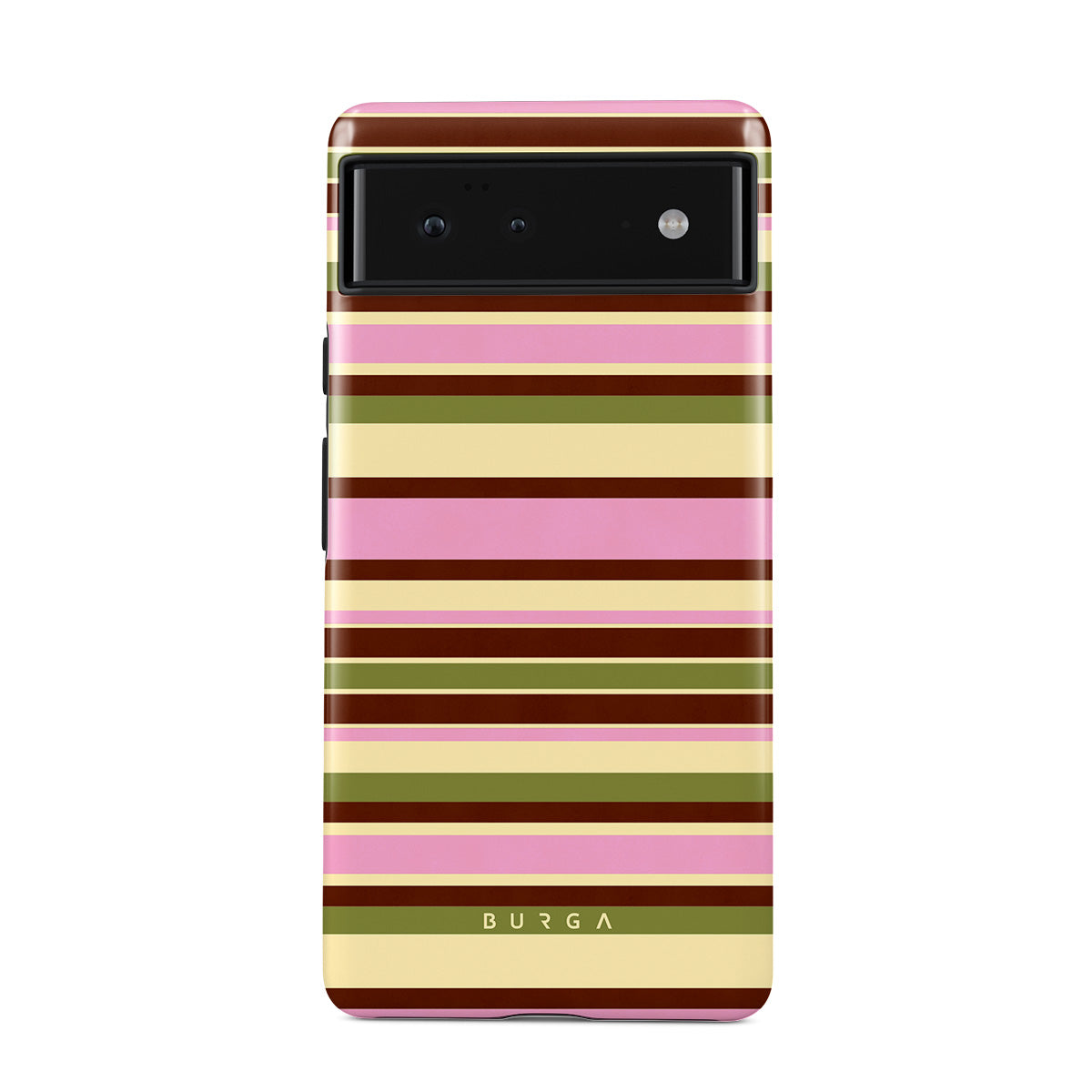 Este design contém: listras pastéis em rosa, amarelo e verde, padrão de verão
