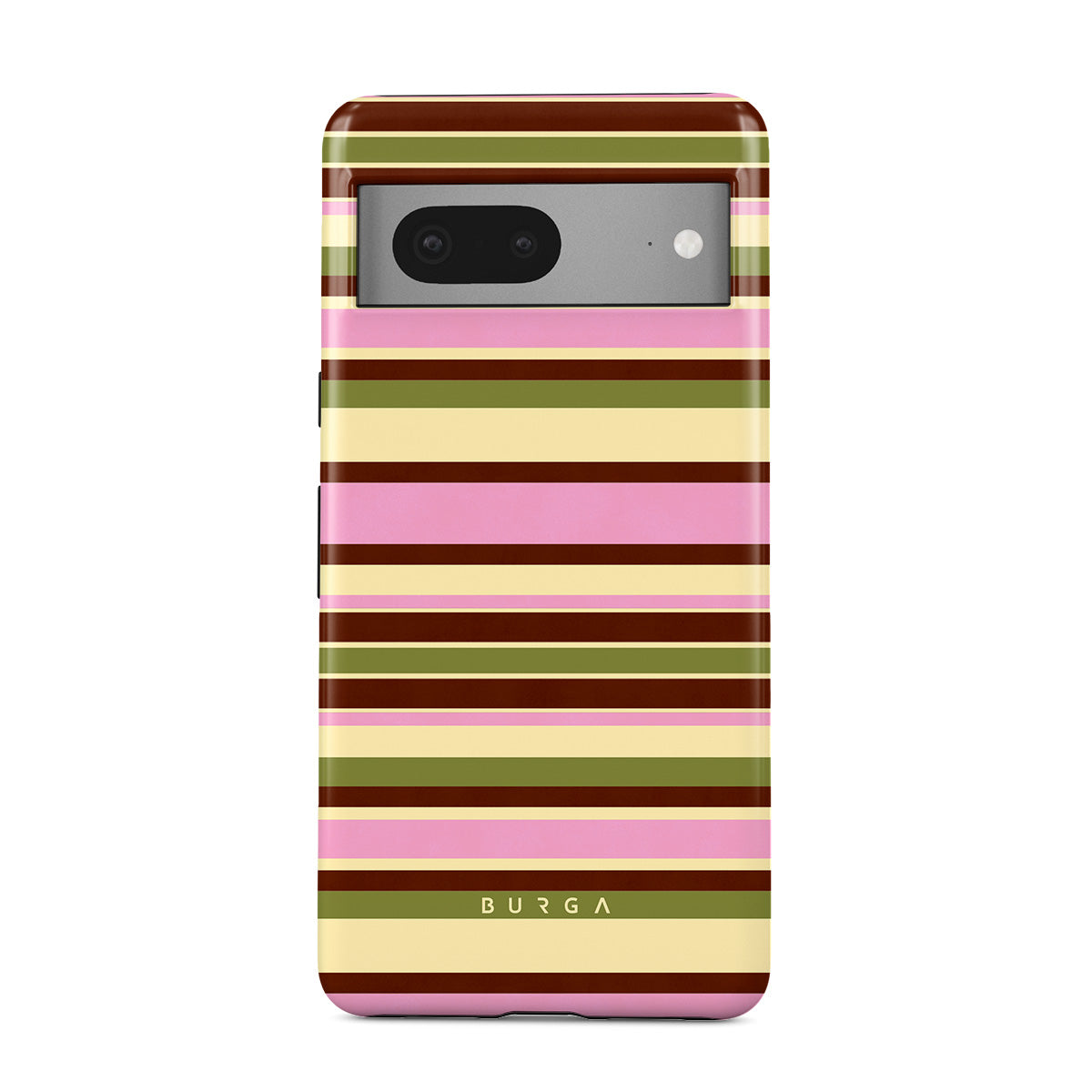 Este design contém: listras pastéis em rosa, amarelo e verde, padrão de verão