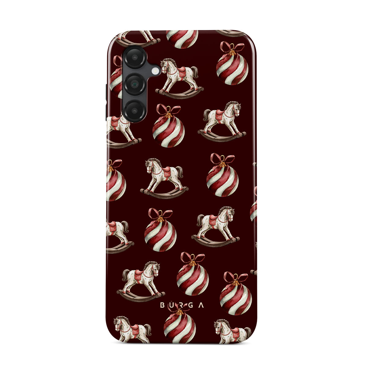 Este design contém: cavalos de baloiço, enfeites, vermelho, padrão de Natal..