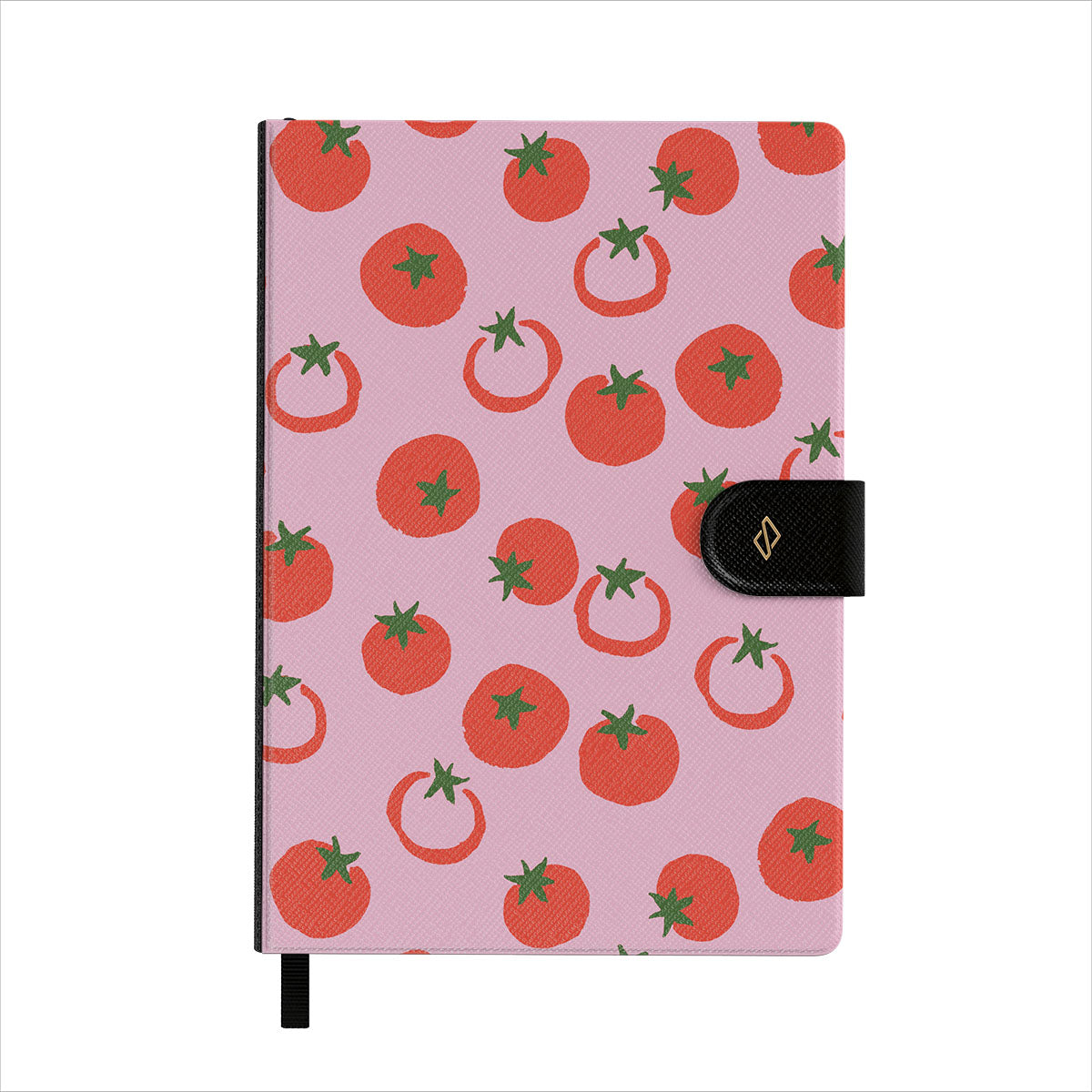 Apresenta padrões BURGA bem detalhados numa capa em pele sintética vegana, com um elegante marcador de páginas em fita preta.