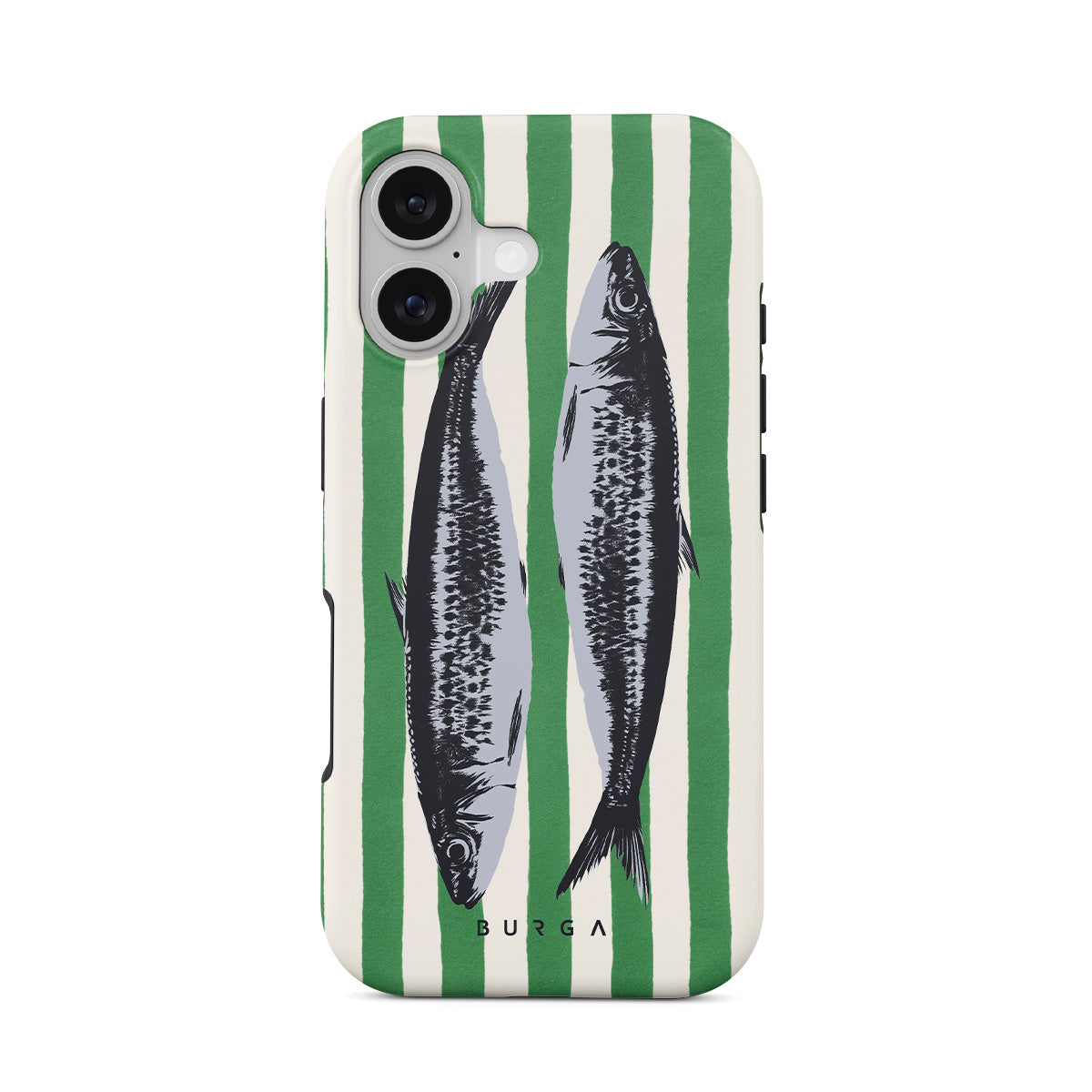 Este design contém:Sardinhas, riscas verdes, motivos oceânicos.