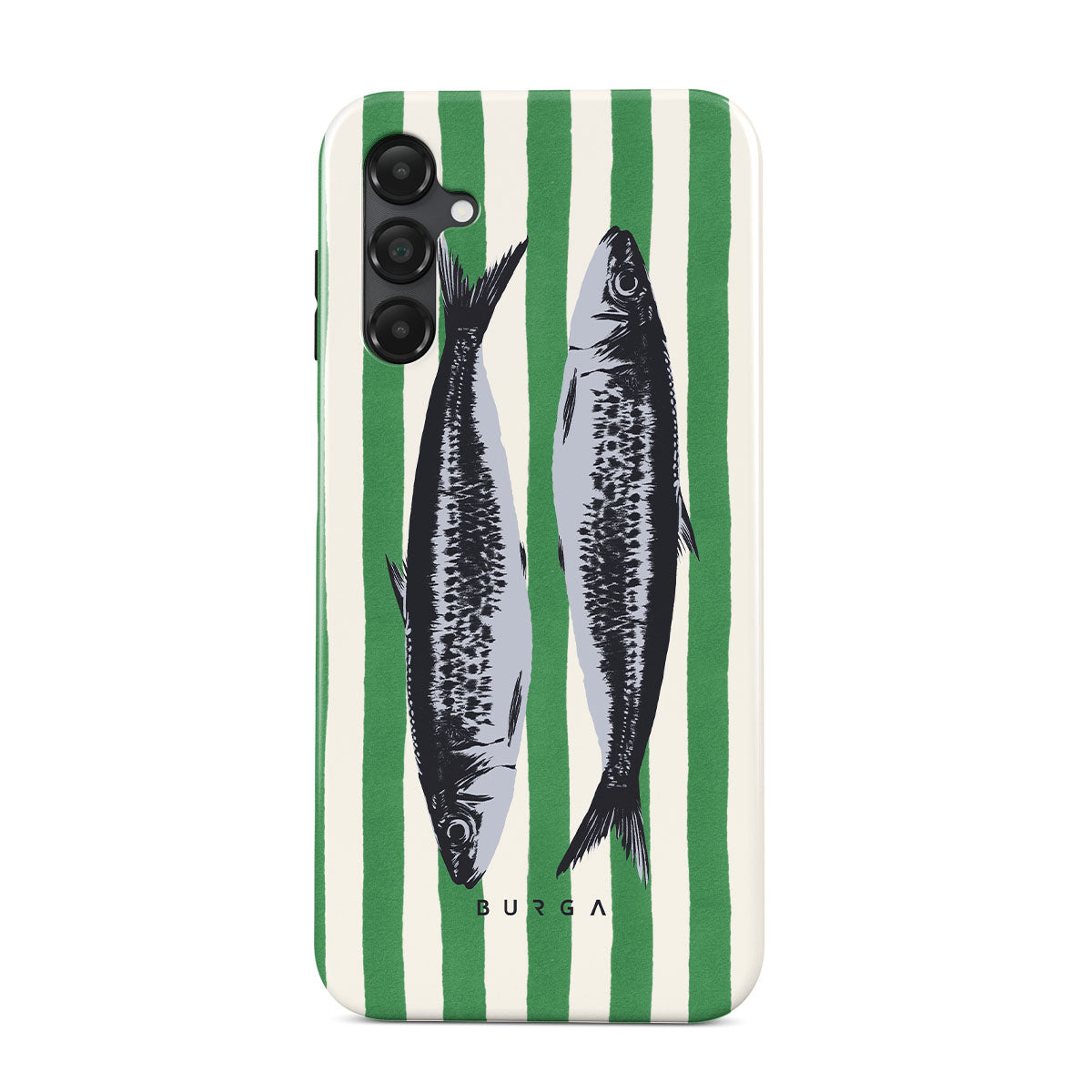 Este design contém:Sardinhas, riscas verdes, motivos oceânicos.