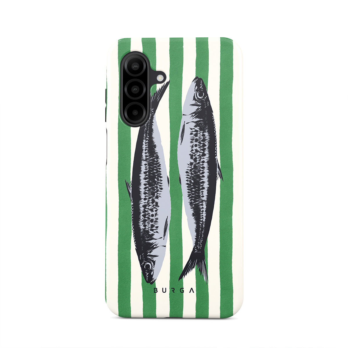 Este design contém:Sardinhas, riscas verdes, motivos oceânicos.