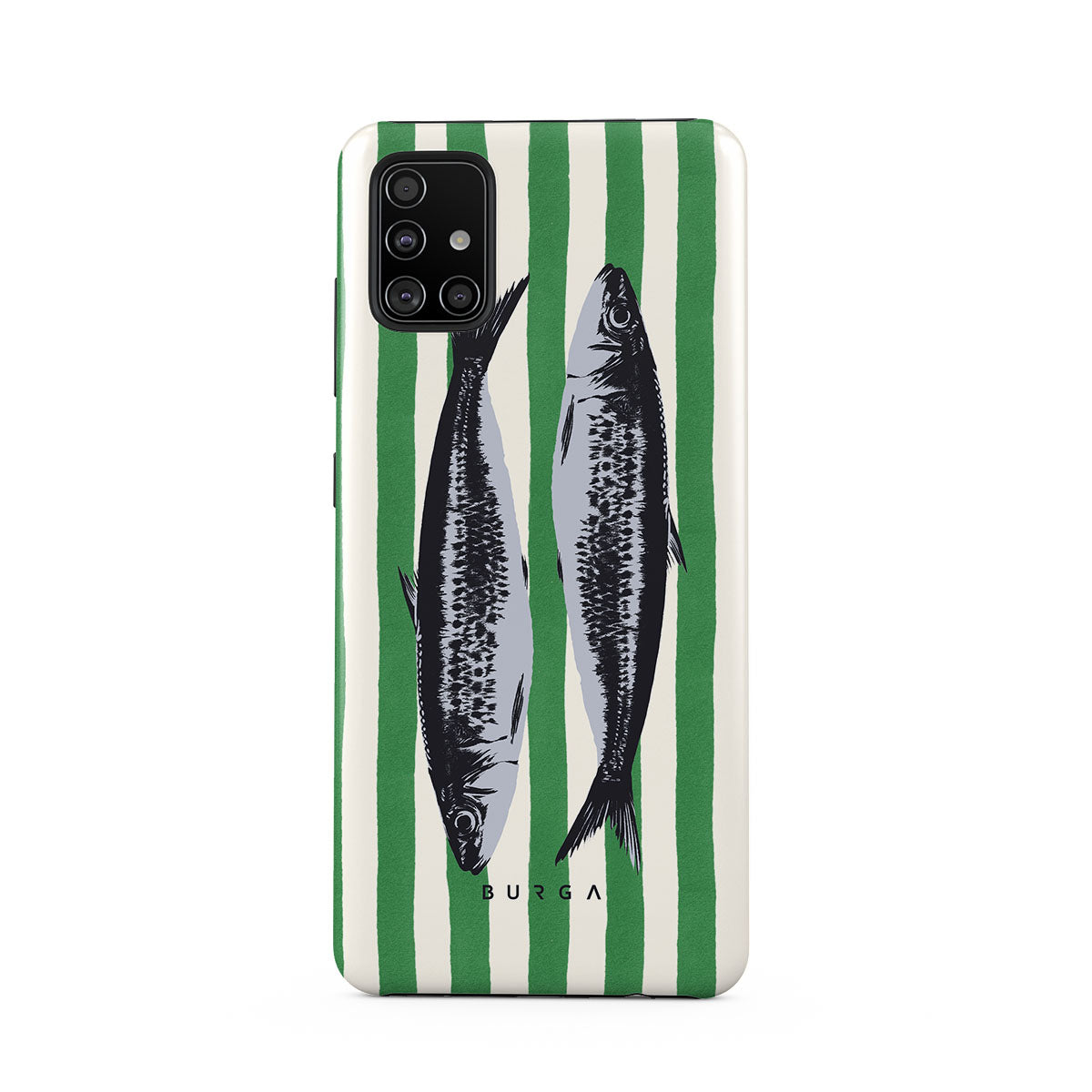 Este design contém:Sardinhas, riscas verdes, motivos oceânicos.
