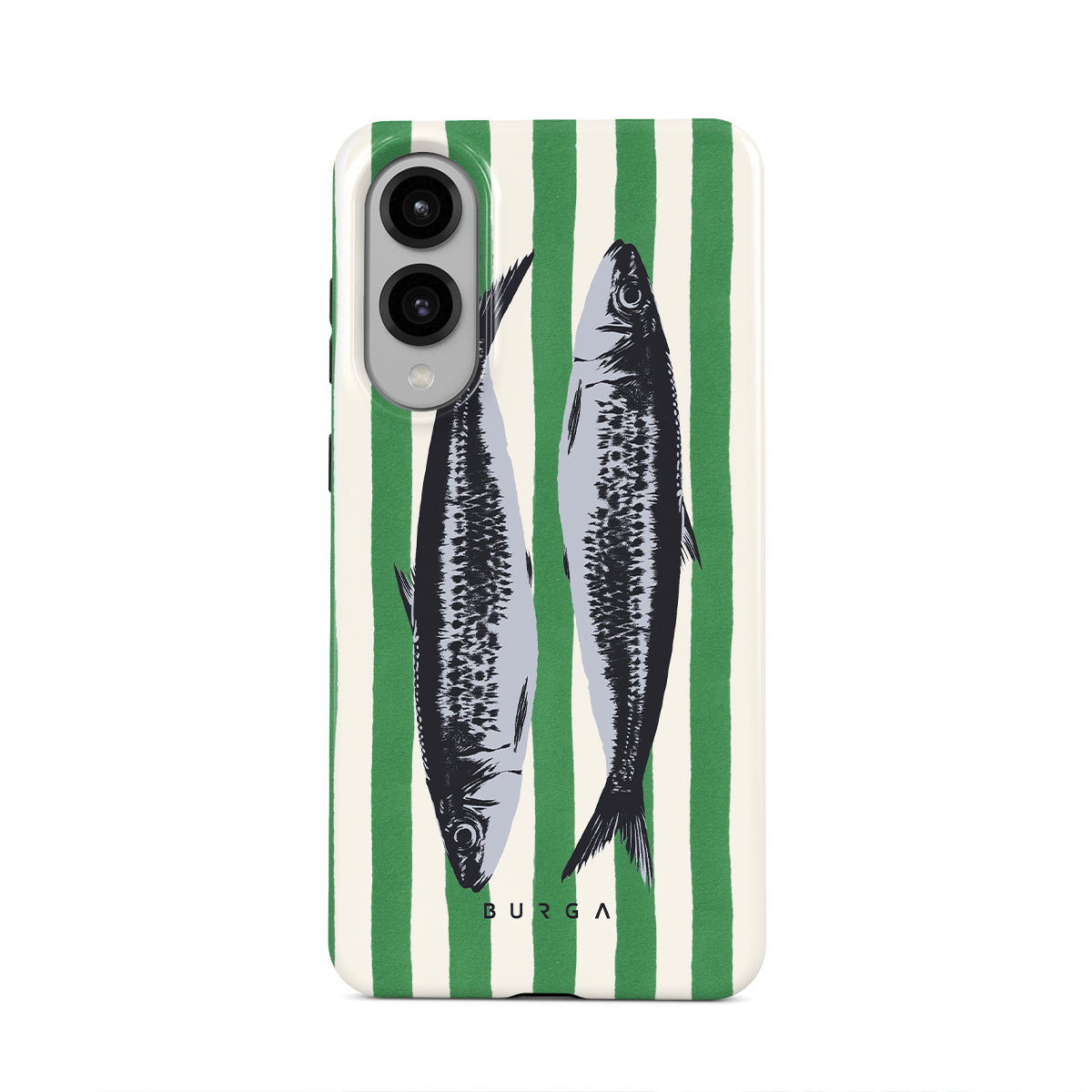Este design contém:Sardinhas, riscas verdes, motivos oceânicos.