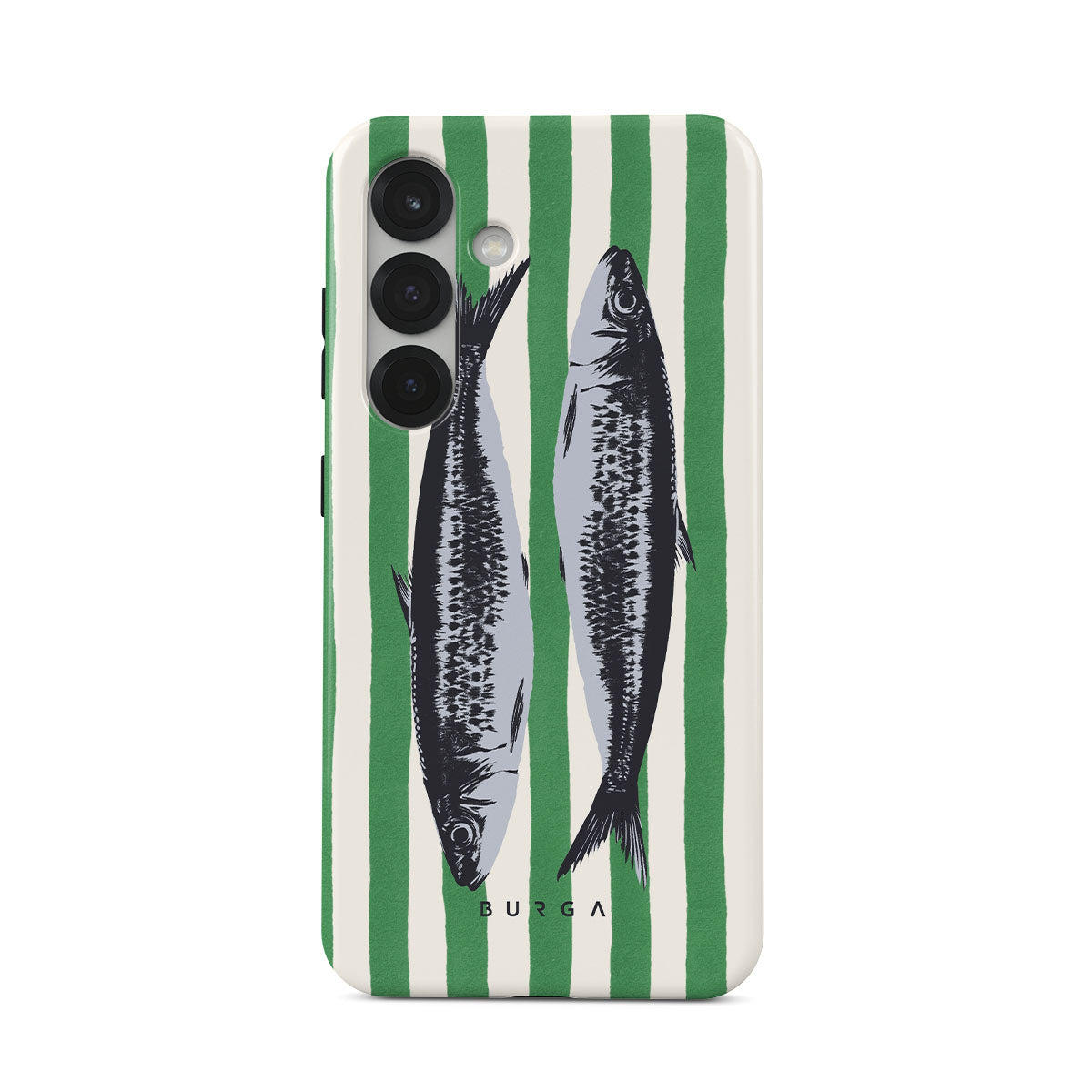 Este design contém:Sardinhas, riscas verdes, motivos oceânicos.