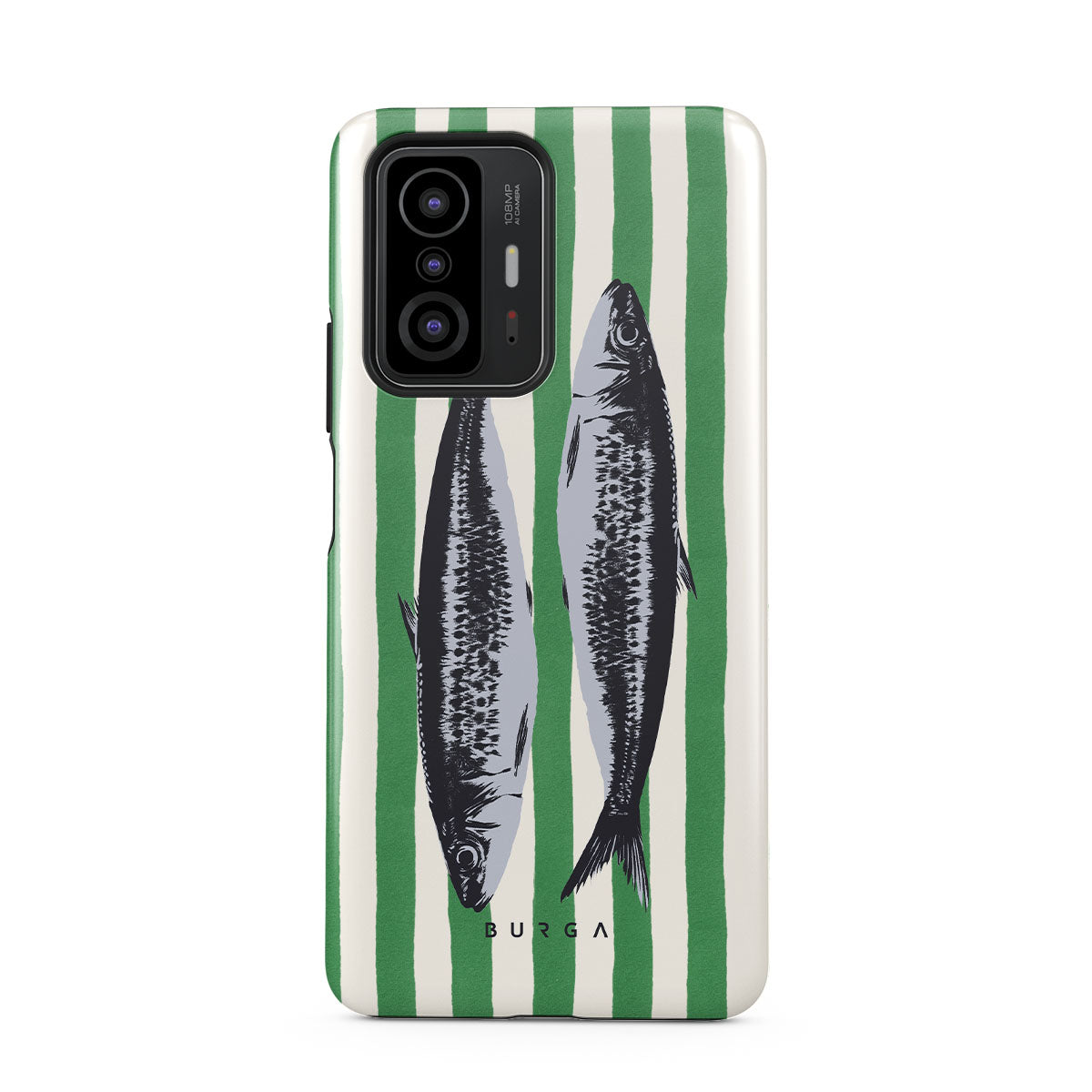 Este design contém:Sardinhas, riscas verdes, motivos oceânicos.