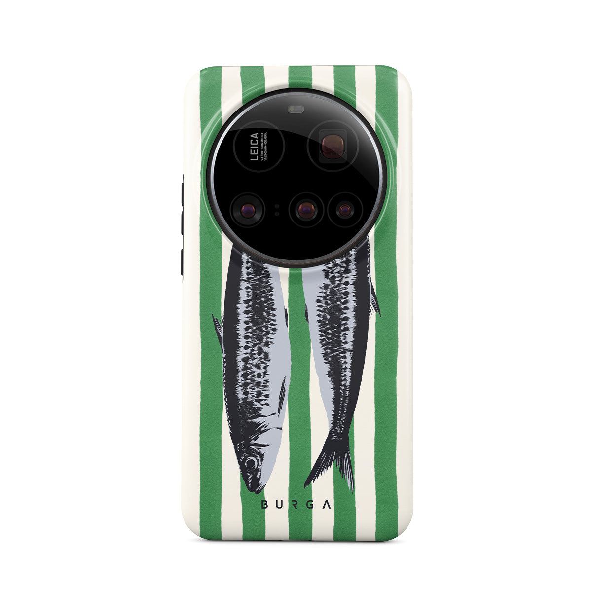 Este design contém:Sardinhas, riscas verdes, motivos oceânicos.