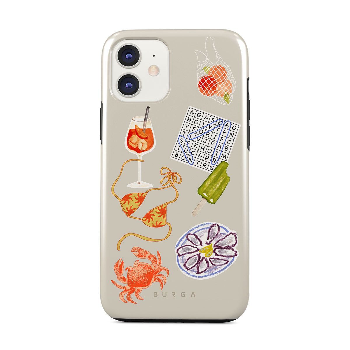 Este design contém: caranguejo, prato de ostras, gelado, palavras cruzadas, cocktail spritz, parte de cima do biquíni, frutas.
