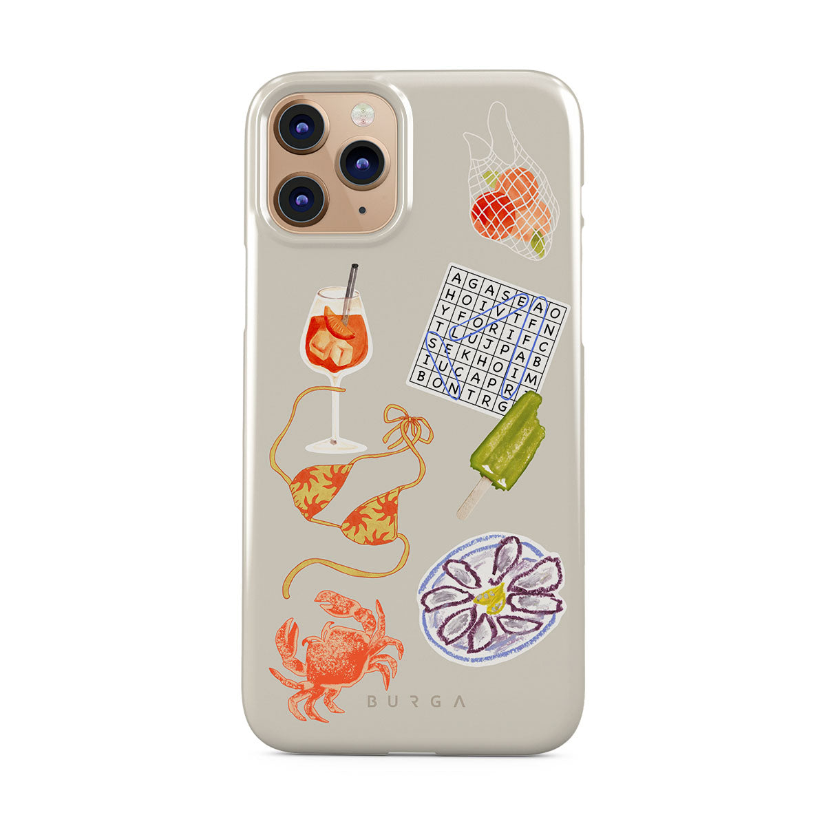 Este design contém: caranguejo, prato de ostras, gelado, palavras cruzadas, cocktail spritz, parte de cima do biquíni, frutas.