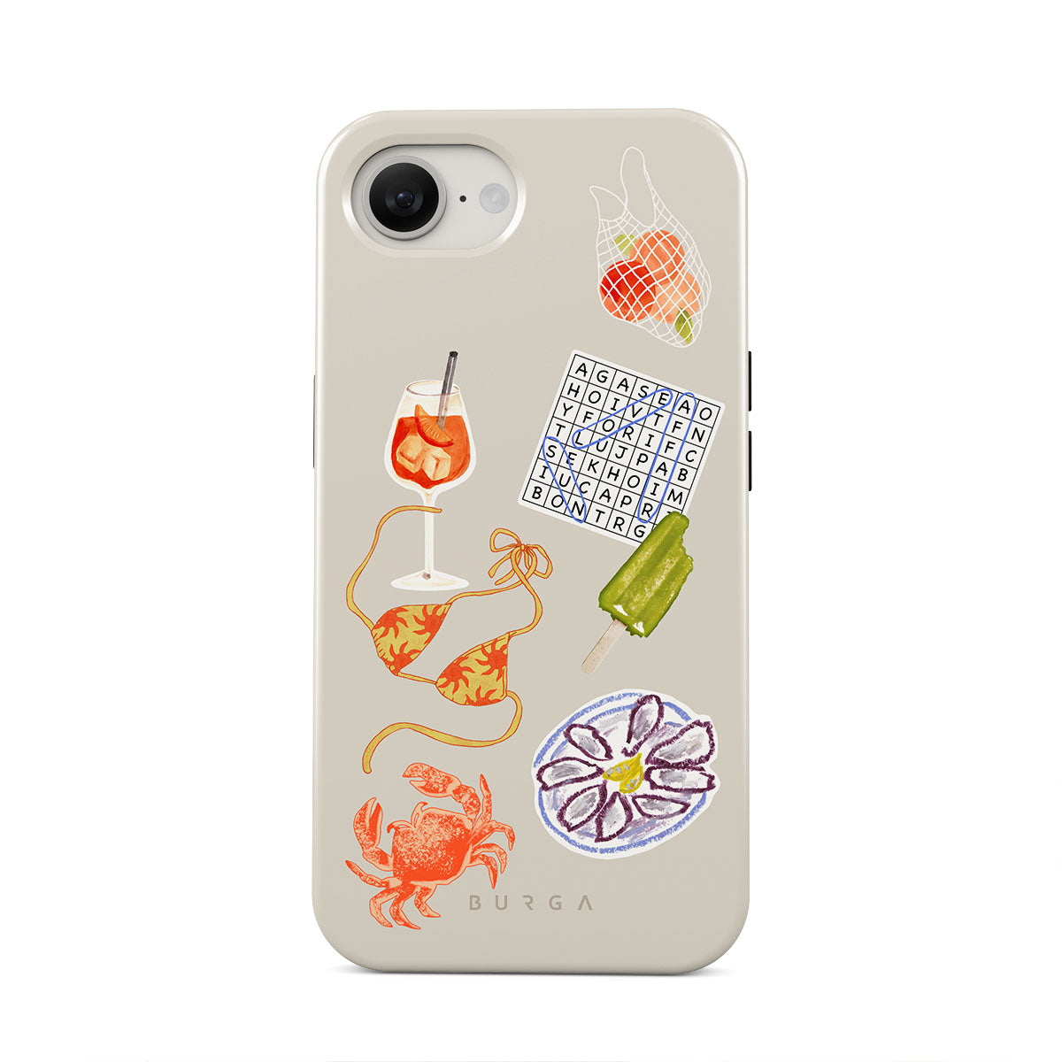 Este design contém: caranguejo, prato de ostras, gelado, palavras cruzadas, cocktail spritz, parte de cima do biquíni, frutas.