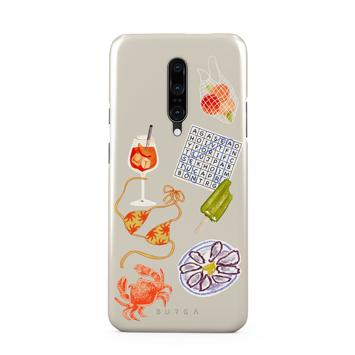 Este design contém: caranguejo, prato de ostras, gelado, palavras cruzadas, cocktail spritz, parte de cima do biquíni, frutas.