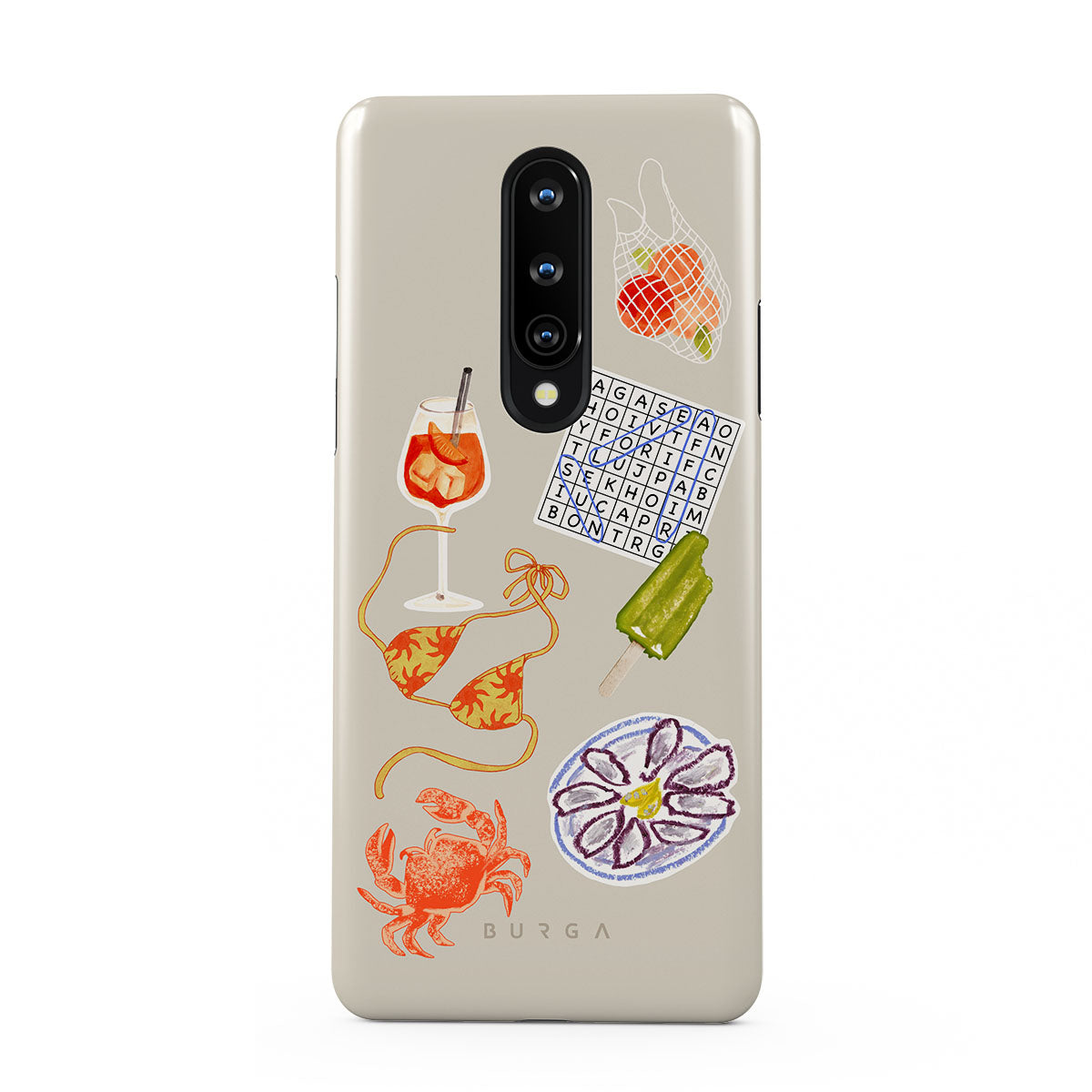 Este design contém: caranguejo, prato de ostras, gelado, palavras cruzadas, cocktail spritz, parte de cima do biquíni, frutas.