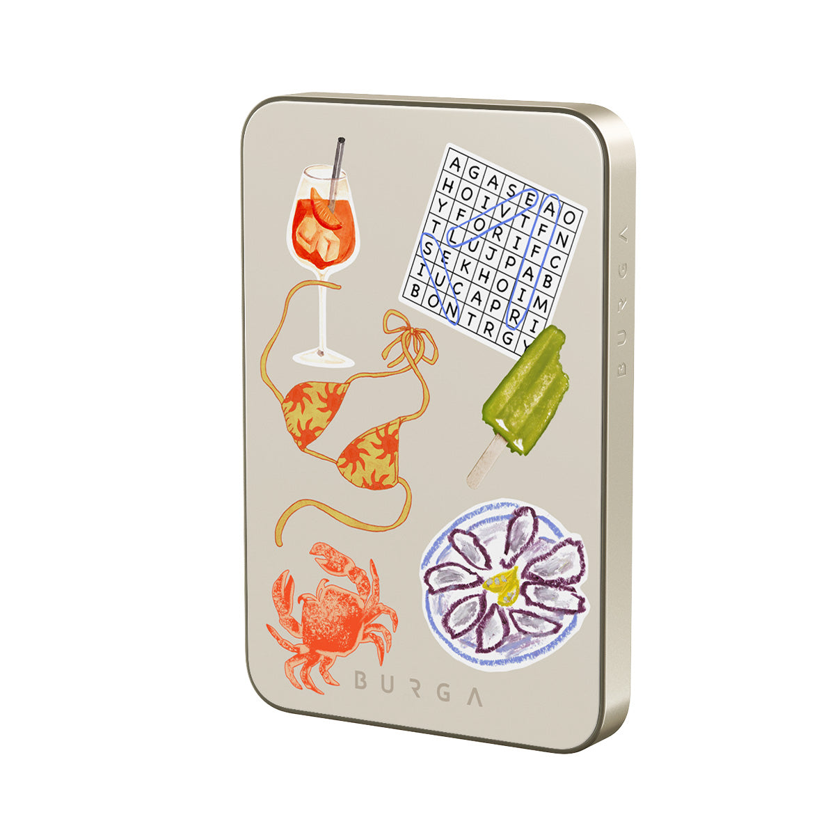 Este design contém: caranguejo, prato de ostras, gelado, palavras cruzadas, cocktail spritz, parte de cima do biquíni, frutas