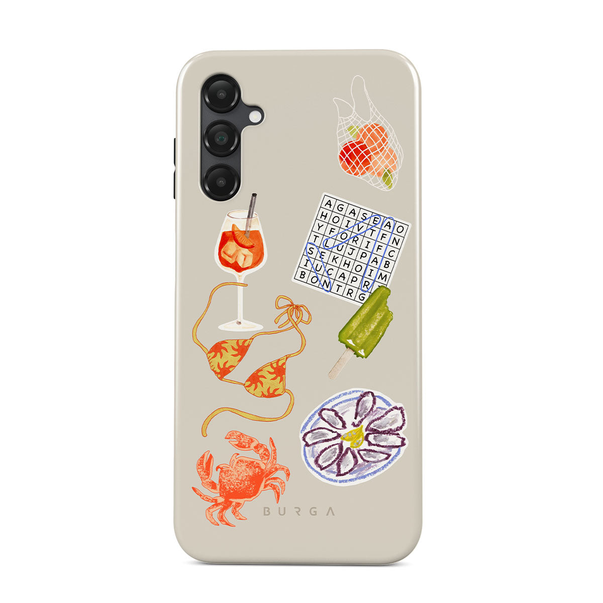 Este design contém: caranguejo, prato de ostras, gelado, palavras cruzadas, cocktail spritz, parte de cima do biquíni, frutas.