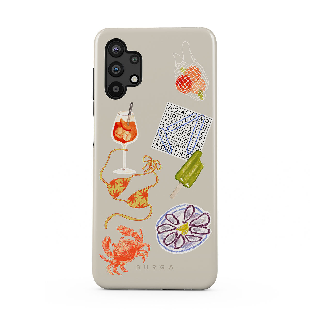 Este design contém: caranguejo, prato de ostras, gelado, palavras cruzadas, cocktail spritz, parte de cima do biquíni, frutas.