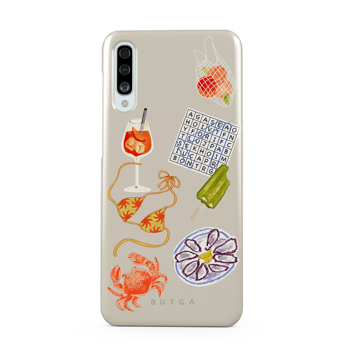 Este design contém: caranguejo, prato de ostras, gelado, palavras cruzadas, cocktail spritz, parte de cima do biquíni, frutas.