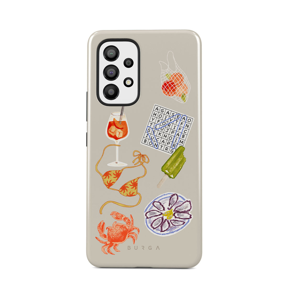 Este design contém: caranguejo, prato de ostras, gelado, palavras cruzadas, cocktail spritz, parte de cima do biquíni, frutas.