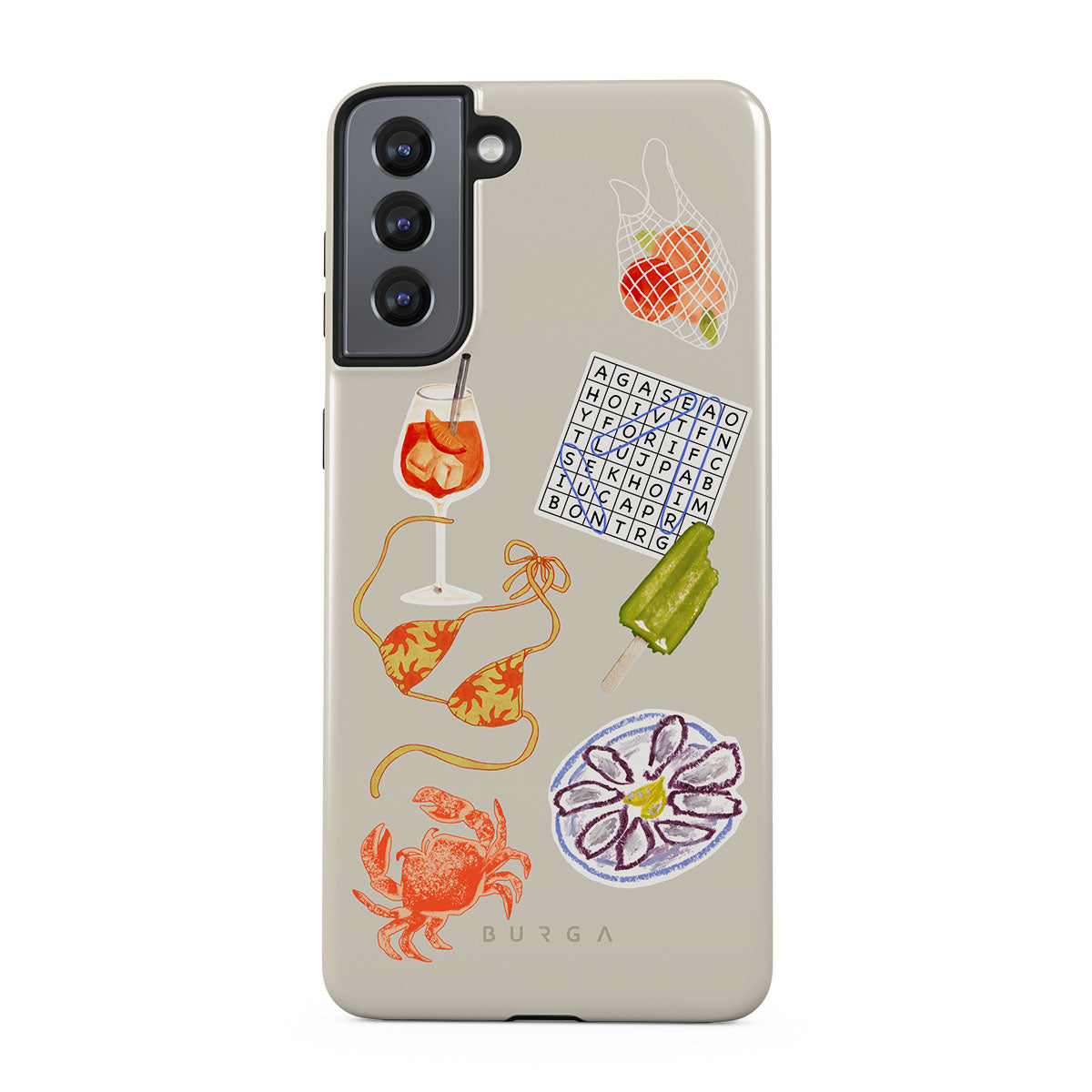 Este design contém: caranguejo, prato de ostras, gelado, palavras cruzadas, cocktail spritz, parte de cima do biquíni, frutas.