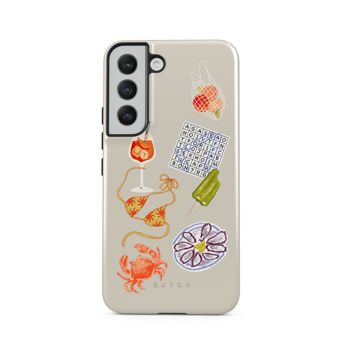 Este design contém: caranguejo, prato de ostras, gelado, palavras cruzadas, cocktail spritz, parte de cima do biquíni, frutas.