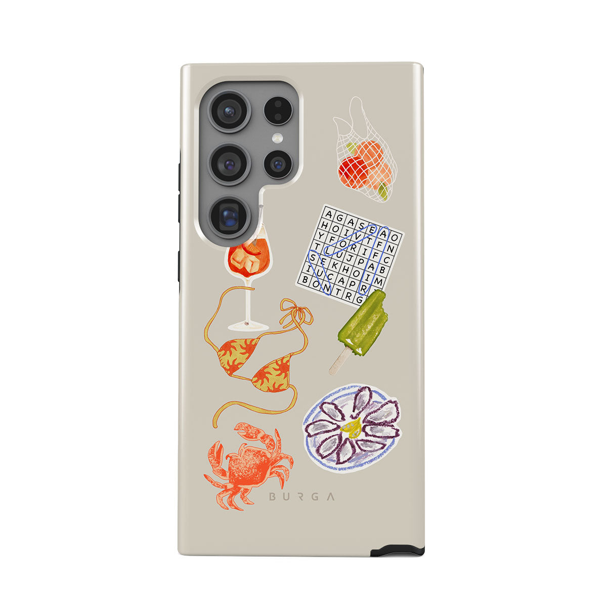 Este design contém: caranguejo, prato de ostras, gelado, palavras cruzadas, cocktail spritz, parte de cima do biquíni, frutas.