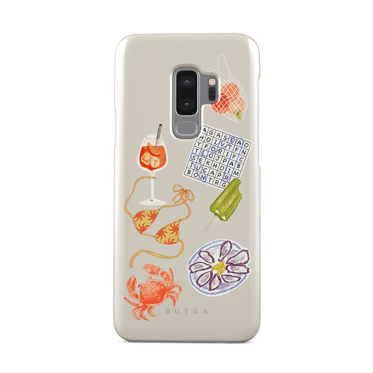 Este design contém: caranguejo, prato de ostras, gelado, palavras cruzadas, cocktail spritz, parte de cima do biquíni, frutas.