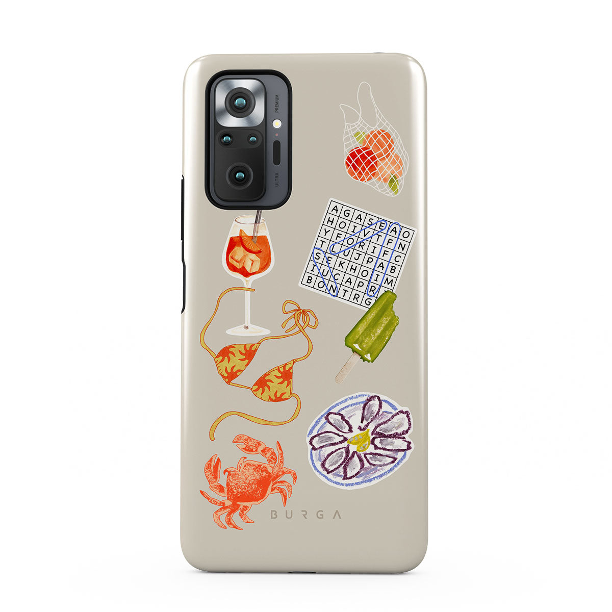 Este design contém: caranguejo, prato de ostras, gelado, palavras cruzadas, cocktail spritz, parte de cima do biquíni, frutas.