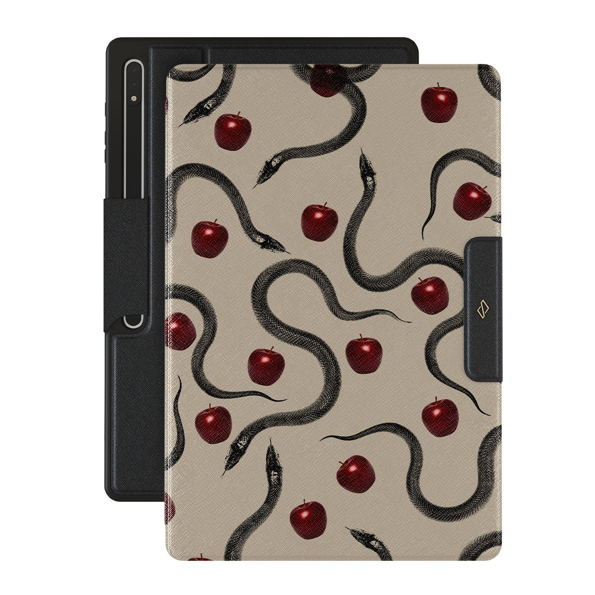 Este design contém: maçãs vermelhas brilhantes, serpentes enroladas, tons de bege.