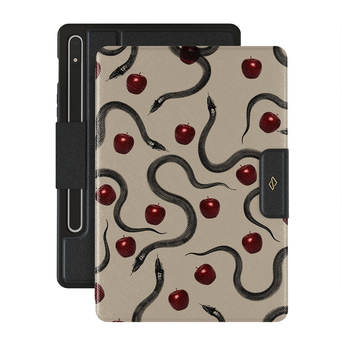 Este design contém: maçãs vermelhas brilhantes, serpentes enroladas, tons de bege.