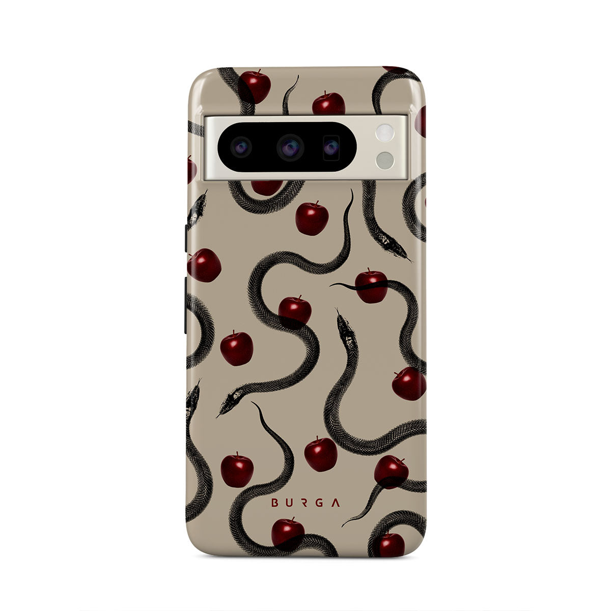 Este design contém: maçãs vermelhas brilhantes, serpentes enroladas, tons de bege.